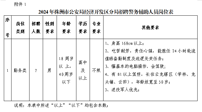 株洲市公安局经济开发区分局本次计划招聘警务辅助人员7名,具体的招聘职位、人数、资格条件等详见附件1《株洲市公安局经济开发区分局招聘警务辅助人员岗位表》。