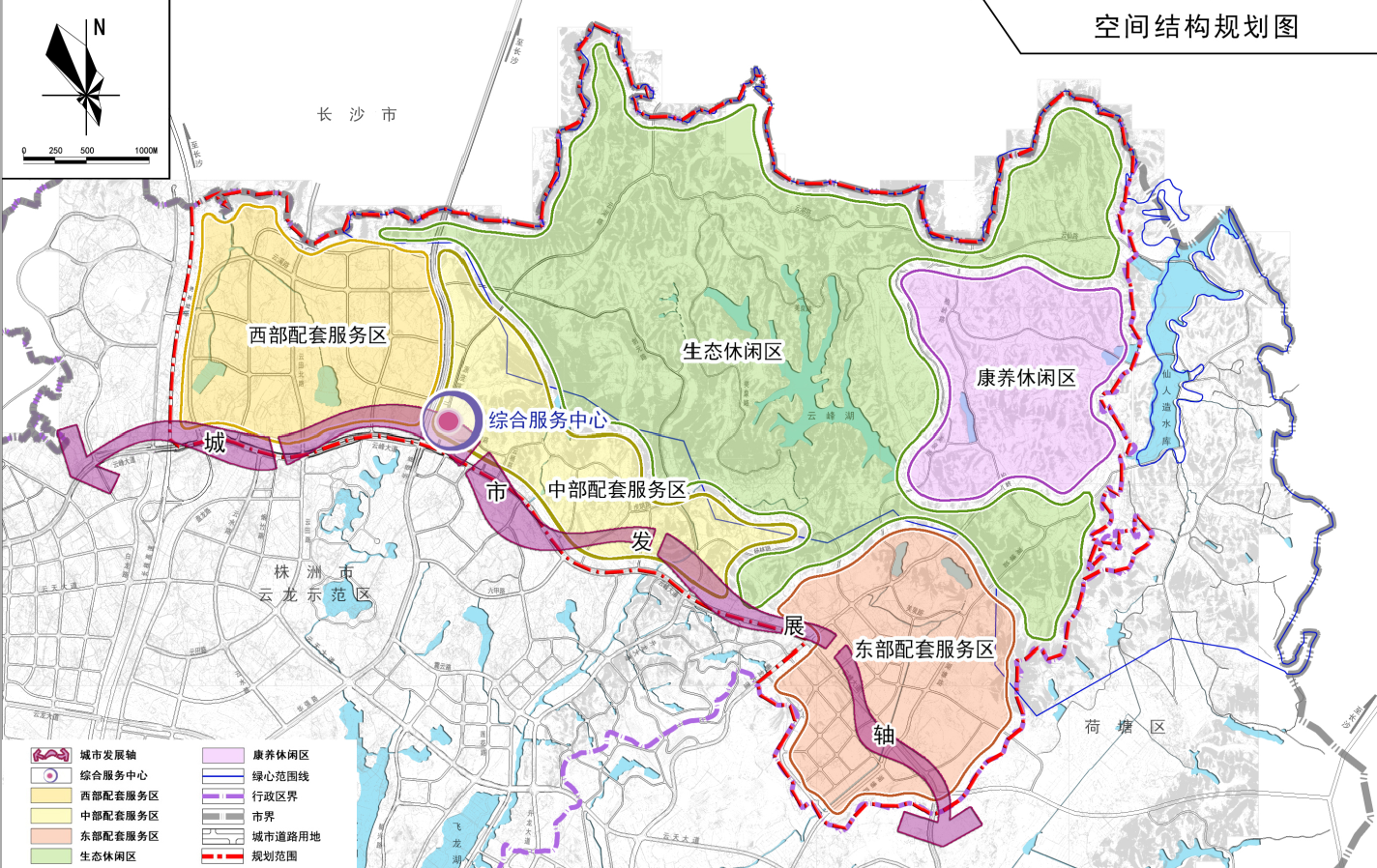 西部配套服务区、中部配套服务区、东部配套服务区、生态休闲区、康养休闲区。