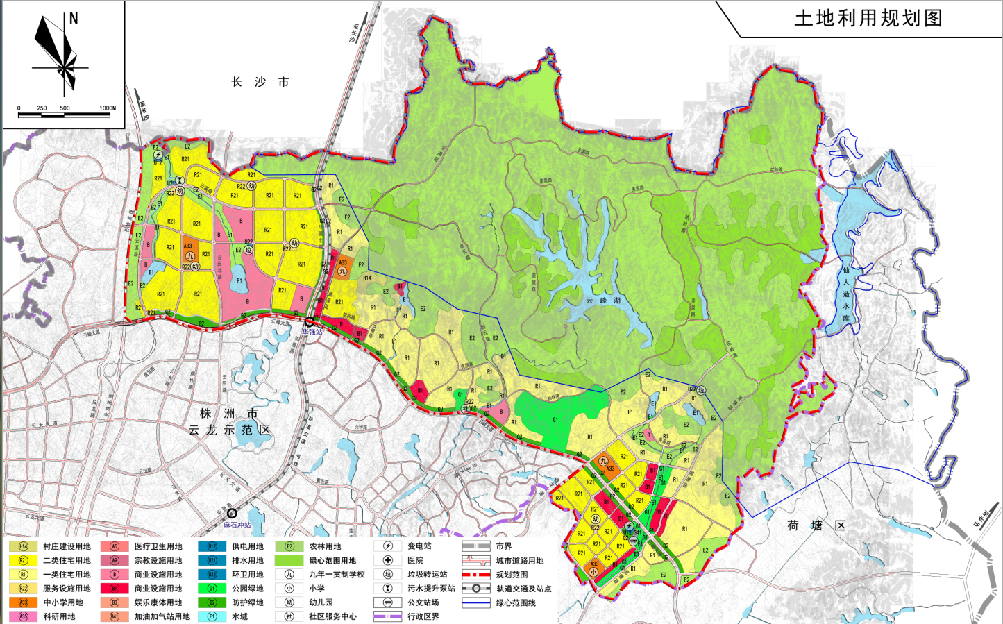 规划区总用地面积2501.51公顷,其中城市建设用地面积为847.18公顷,占总用地面积的33.87%,绿心范围内用地面积为1458.45 公顷,占总用地面积的58.30%。