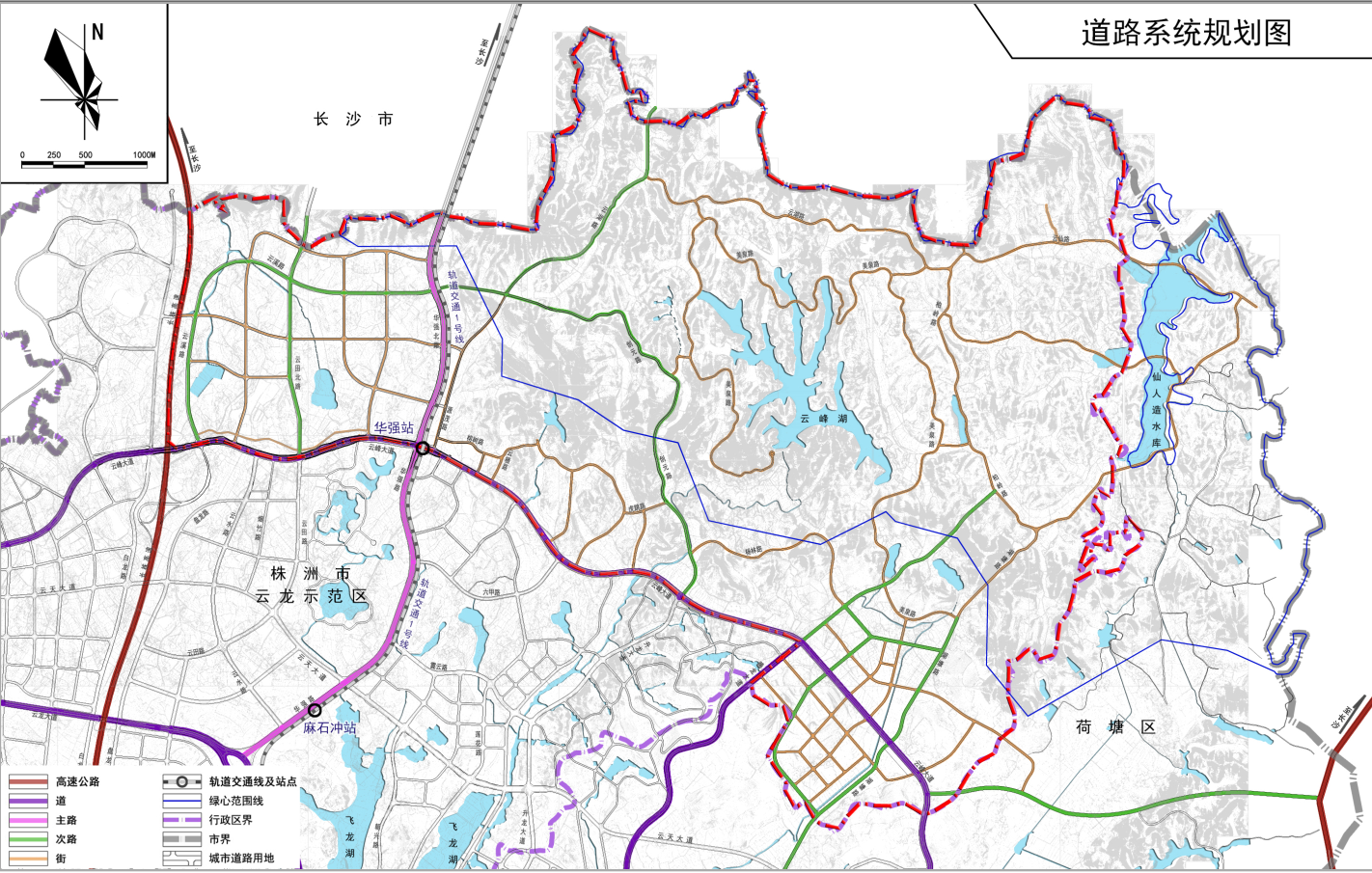 规划区内道路骨架主要采用方格网的形式。而绿心内区域的路网结构沿袭了云峰湖地区原有的依山就势的路网布局。 规划区道路主干网结构为“一横两纵”:一横为云峰大道;两纵为华强北路和腾龙大道。