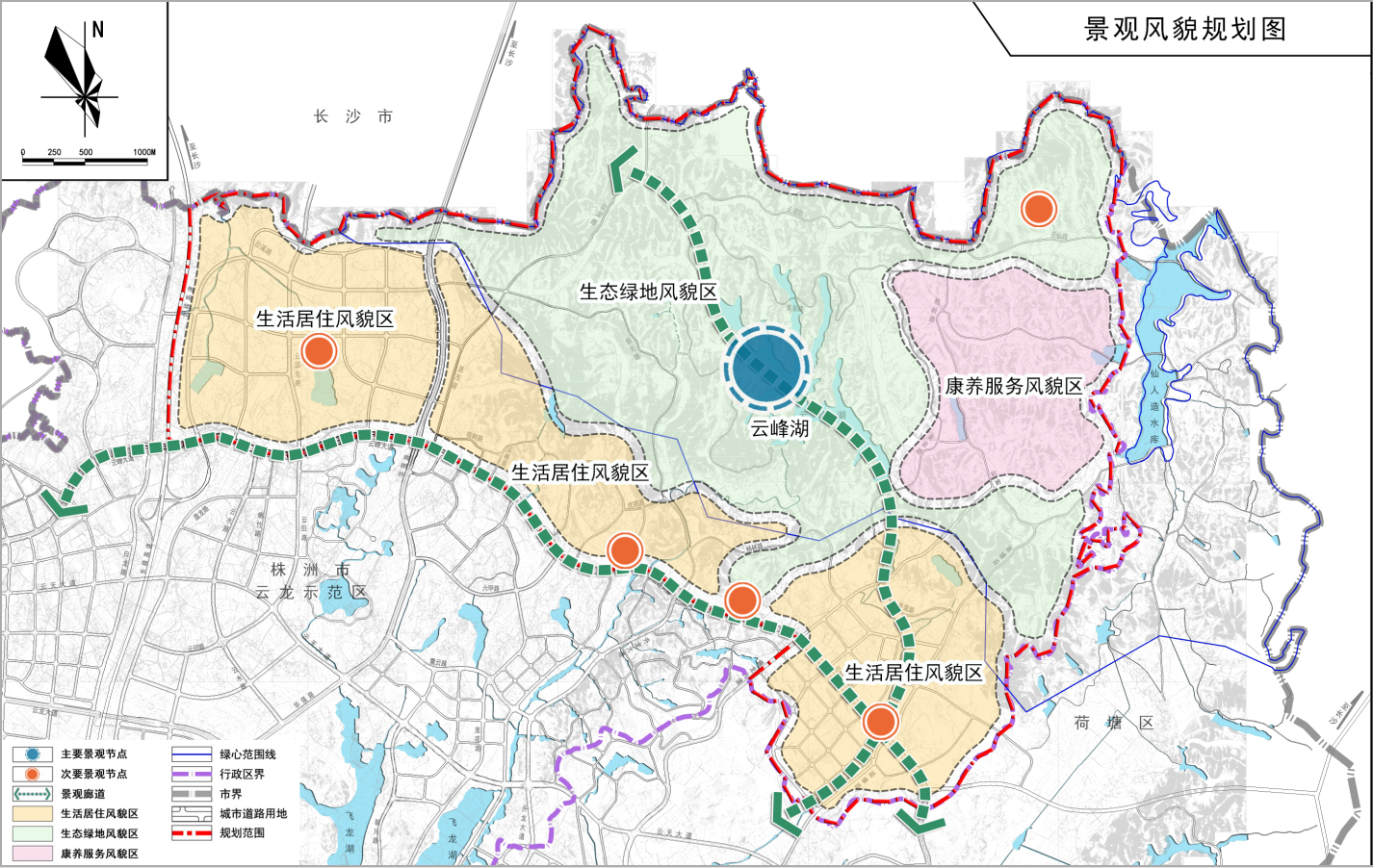二廊:沿云峰大道绿地形成一条景观廊道;沿规划水系、绿地及云峰湖形成一条景观廊道。