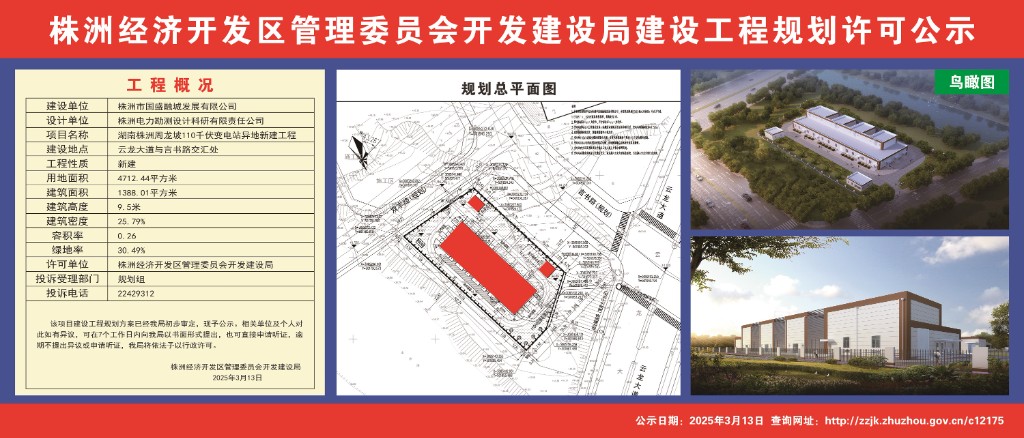 湖南株洲周龙坡110千伏变电站异地新建工程规划许可公示